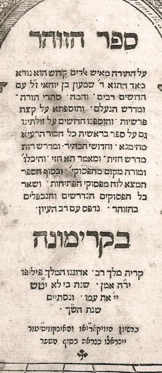 This page describes the cover page of the Zohar printed in Cremona, Italy in 1560 by the Christian publisher Vincenzo Conti. More about Cremona and Conti A high resolution image of this page is available here. This excellent translation was made by a friend of mine.